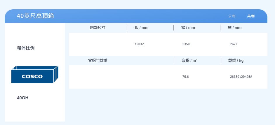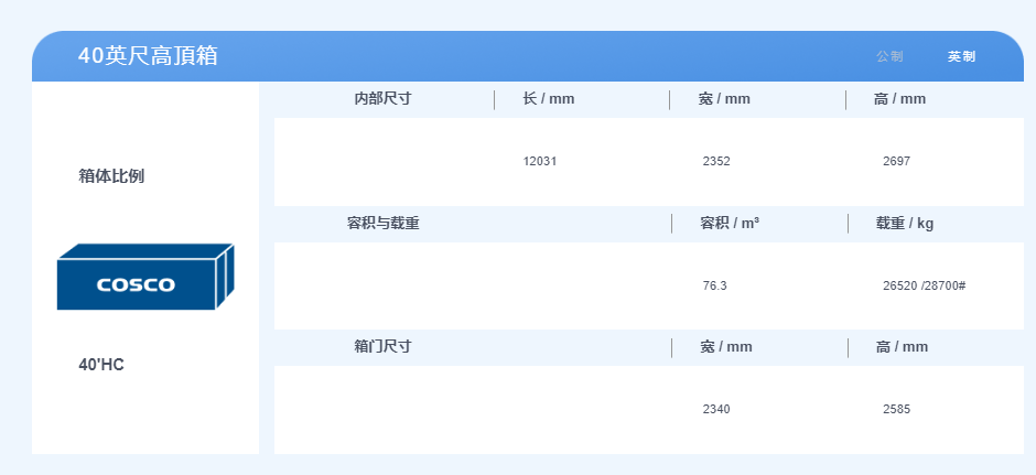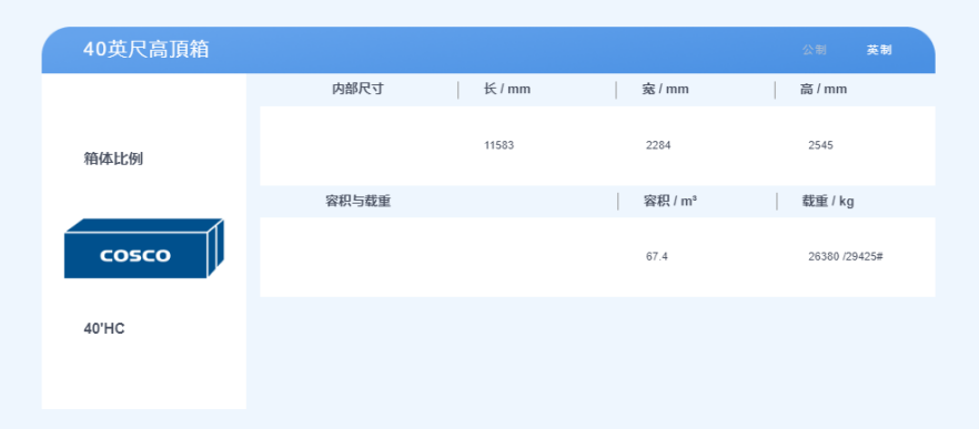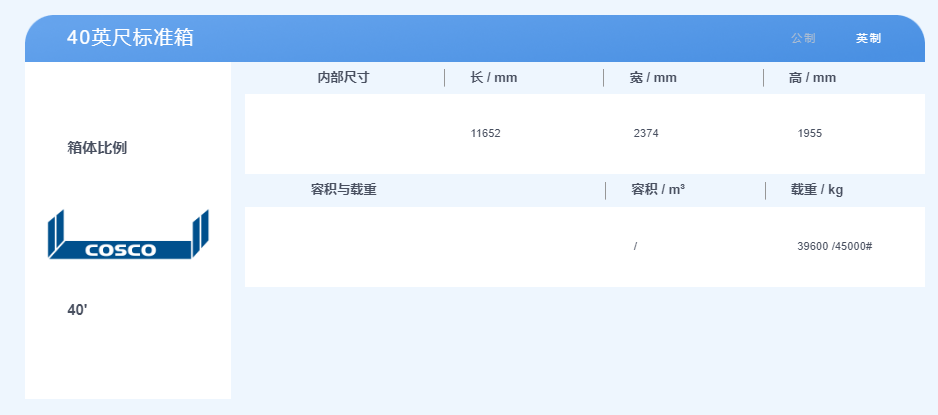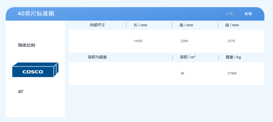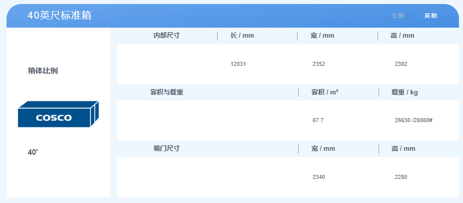 40英尺集裝箱,體積是2.3米寬,2.3米高,12米長(zhǎng),最大貨物載重約28噸。
