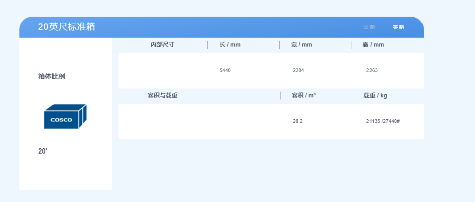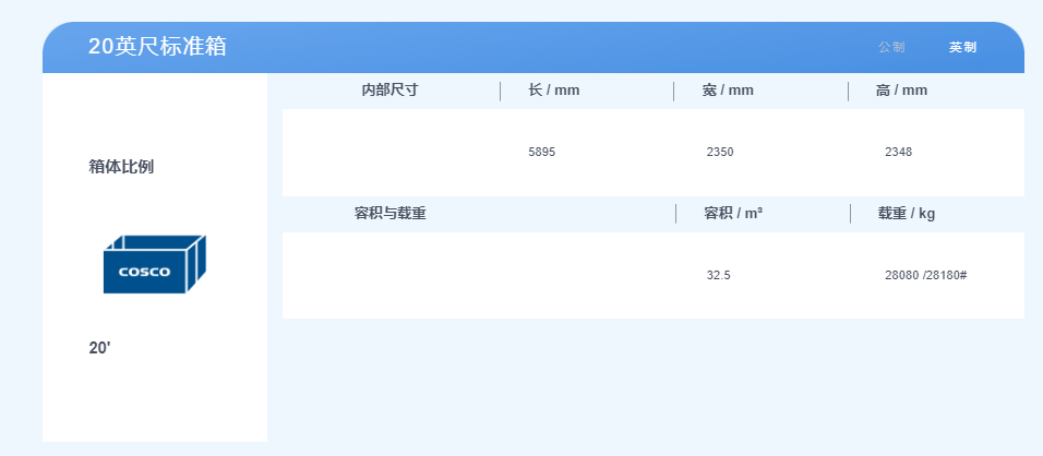 20英尺集裝箱,體積是2.3米寬,2.3米高,6米長(zhǎng),最大貨物重量約28噸;
