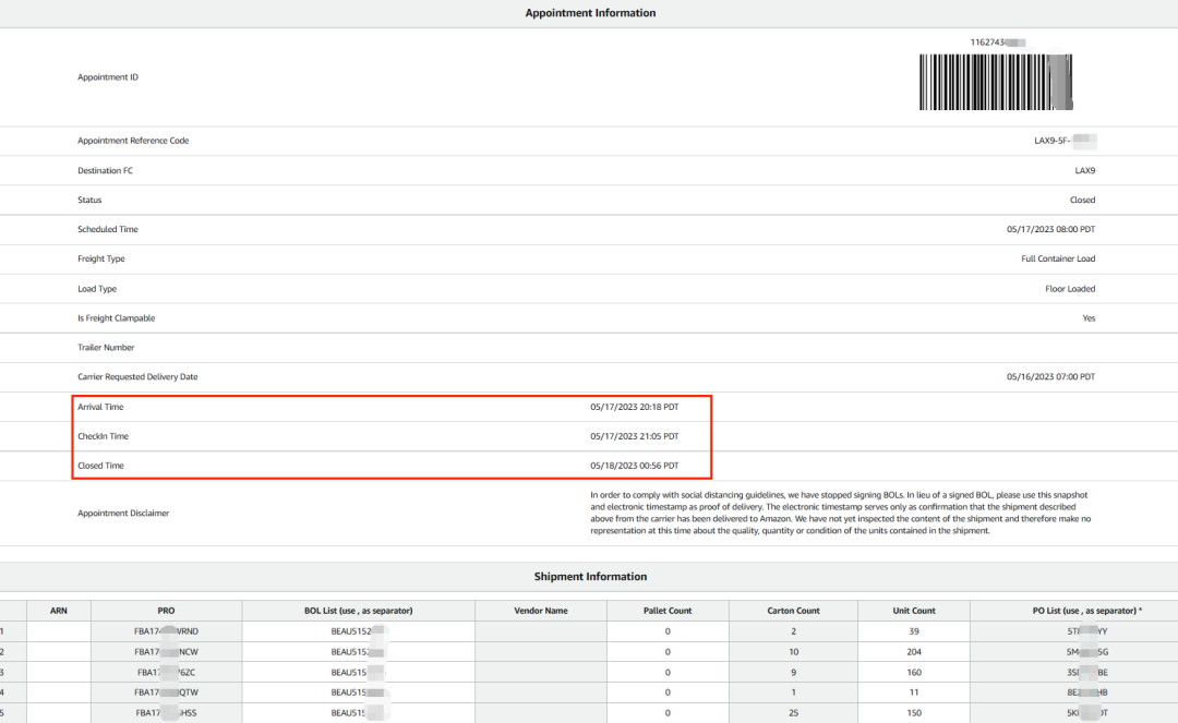 LAX9之所以難送,是因為其爆倉推約刪約常態化,也是目前送倉排隊時間久的倉庫之一,許多同行已經采取亞馬遜提貨的方式交倉,LAX9院子里堆滿Amazon freight的貨箱待卸貨(如圖3),為保障客戶時效,德速仍堅持自送倉,雖然也遭遇亞馬遜臨時變更預約時間,好在有CULine團隊支持和車隊緊密配合,最終貨柜趕上預約時間按要求送達,客戶在中國時間18日上午就開始反饋有上架。